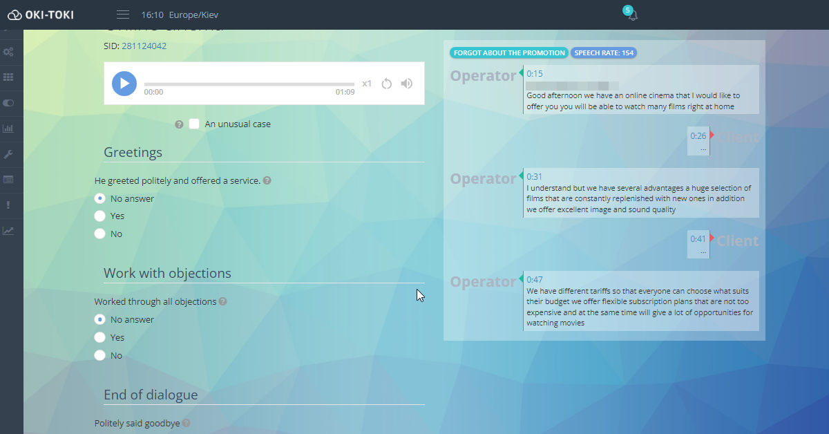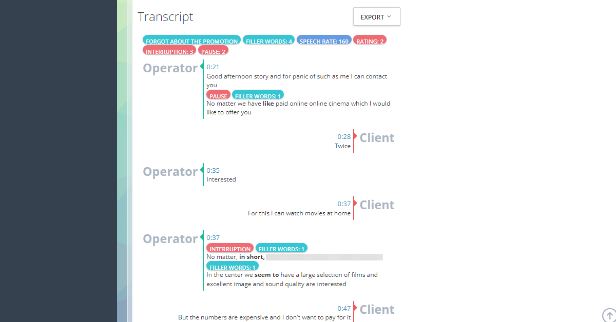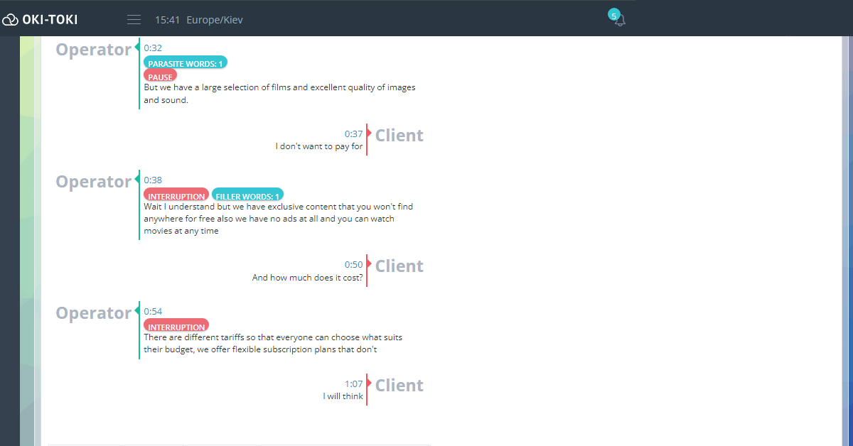 • Перебиття клієнта. Мовленнєва аналітика в стенограмі дозволяє виявити випадки, коли оператор перериває розмову з клієнтом. Це може свідчити про небажану поведінку чи неуважність співробітника.