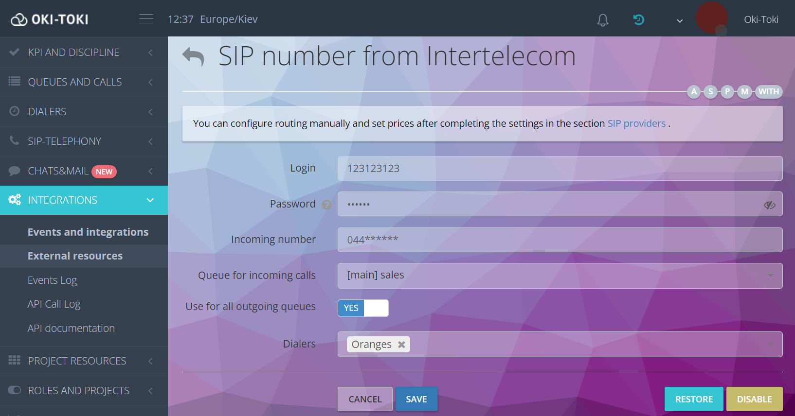 Інтеграція з SIP-провайдером Інтертелеком вийшла на новий рівень. Підключення стало зручніше і швидше. Налаштування вхідної лінії, вихідної, контроль, все це стало доступно з одного місця! Скористатися новим способом підключення номера від Intertelecom можна в розділі Інтеграції – Зовнішні ресурси.