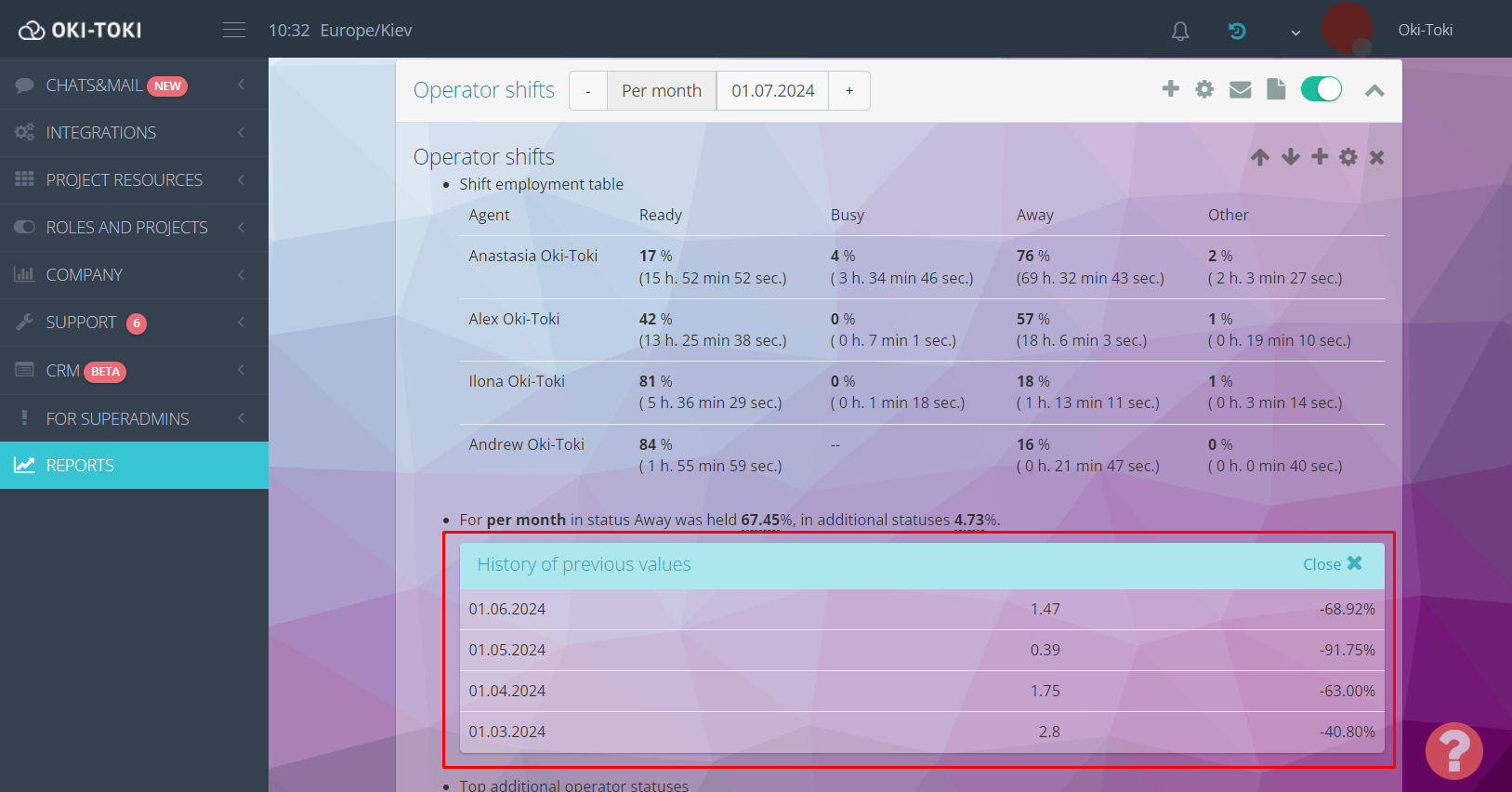 - Нова секція: “Зміни операторів”, що відображає перший та останній статус оператора за період, дані про їхню зайнятість, ефективність та не тільки.