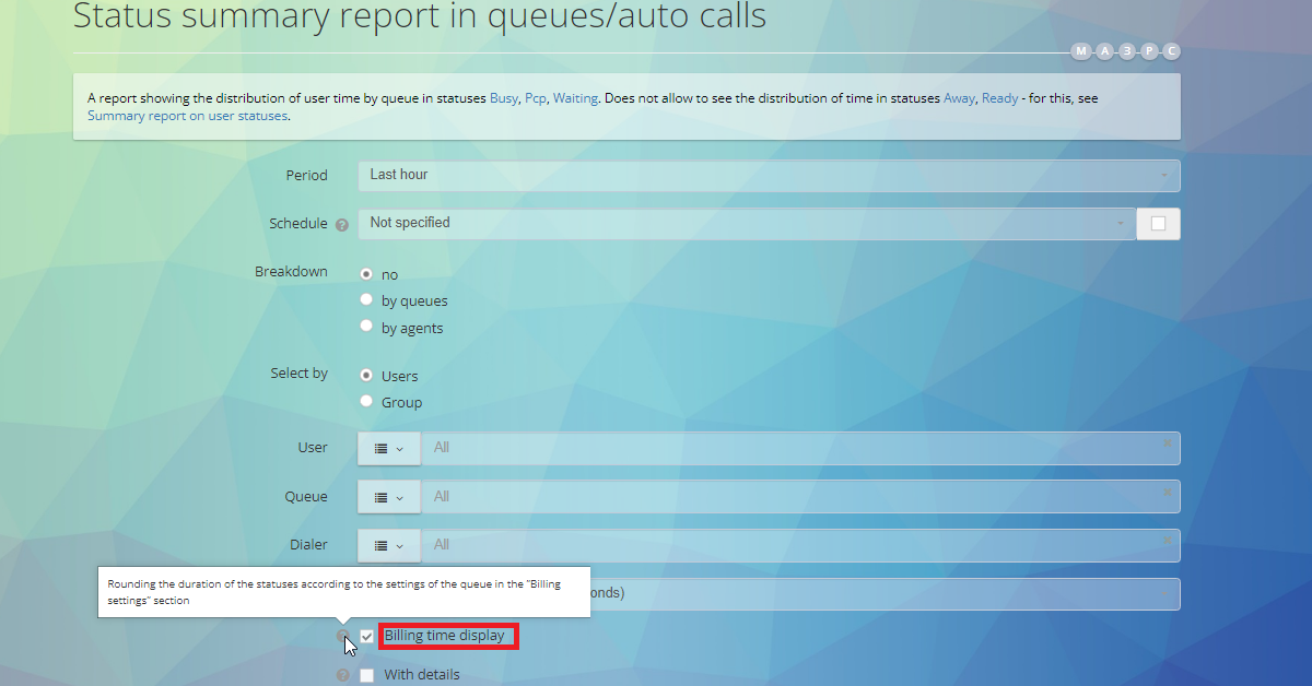 - При побудові Зведених звітів можна відображати дані, з урахуванням параметрів тарифікації. Зведені звіти по чергам та користувачам можуть використовуватися для підрахунку зарплати. При виборі параметрів для формування звіту не забудьте поставити галочку “Відображати тарифікаційний час”.