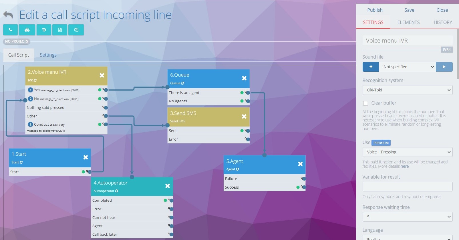- Здійснення вихідних дзвінків: автоматичний обдзвін клієнтів за сценарієм, фіксація даних, розпізнавання відповідей та DTMF-натискань.