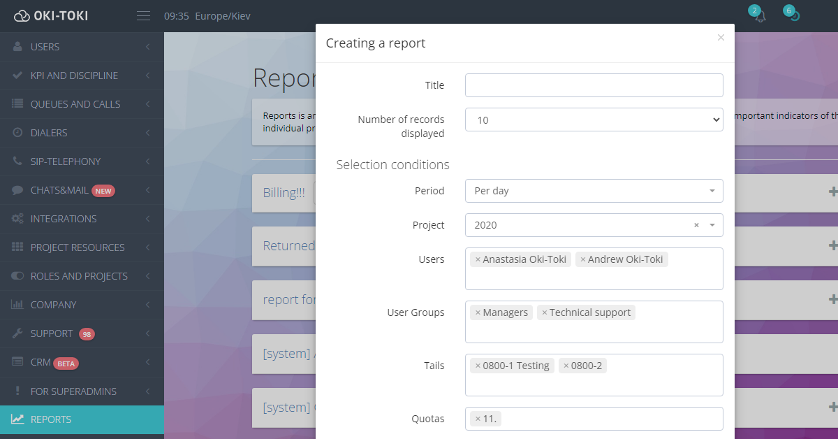 Приклад: Вам потрібно створити спеціальний звіт для вашого генерального директора, який буде відображати тільки ключові фінансові показники. Ви обираєте необхідні секції: ”Дані про активність черг”, ”Міжнародні показники”, “Витрати в Окі-Токі”, “Використання API” і “KPI” та створюєте індивідуальний звіт, який допоможе вашому керівництву приймати рішення на основі отриманих даних.