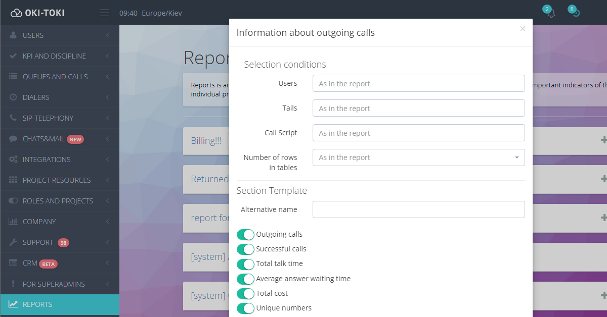 Приклад: Ви хочете відстежувати ефективність вашого кол центру. Вам потрібно включити в звіт наступні секції: “Робота автообзвону”, “Відомості про вхідні та вихідні дзвінки”, “Статистика БП”, ”Міжнародні показники”, “Нормативи KPI”.