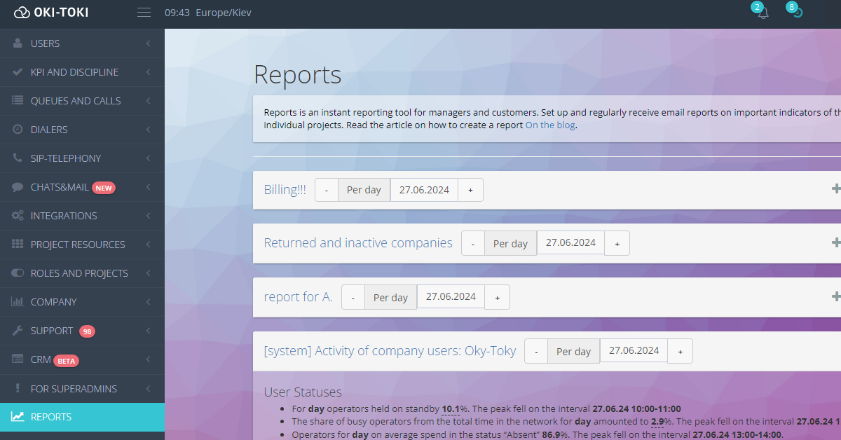 Часто буває, що замовники вимагають регулярні звіти про роботу вашого кол центру. Окі-Токі надає автоматичну відправку звітів по електронній пошті, що спрощує взаємодію з замовниками.